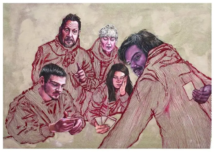 De schilderijen van Femke Goyvaerts zijn kleurrijke vertalingen van het absurde in het alledaagse, als reflectie op familie, identiteit en de vaak ongemakkelijke dynamiek die daartussen ontstaat. Een terugkerend element is het gebruik van een rasterpatroon in de kledij van de personages. Dat patroon fungeert als een visuele draad, een verbindend motief dat de figuren symbolisch koppelt aan een gedeeld familie-orgaan.
